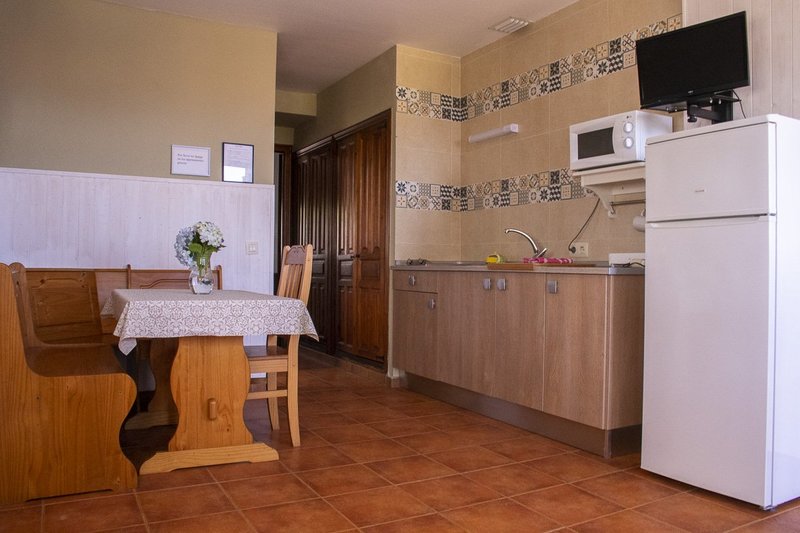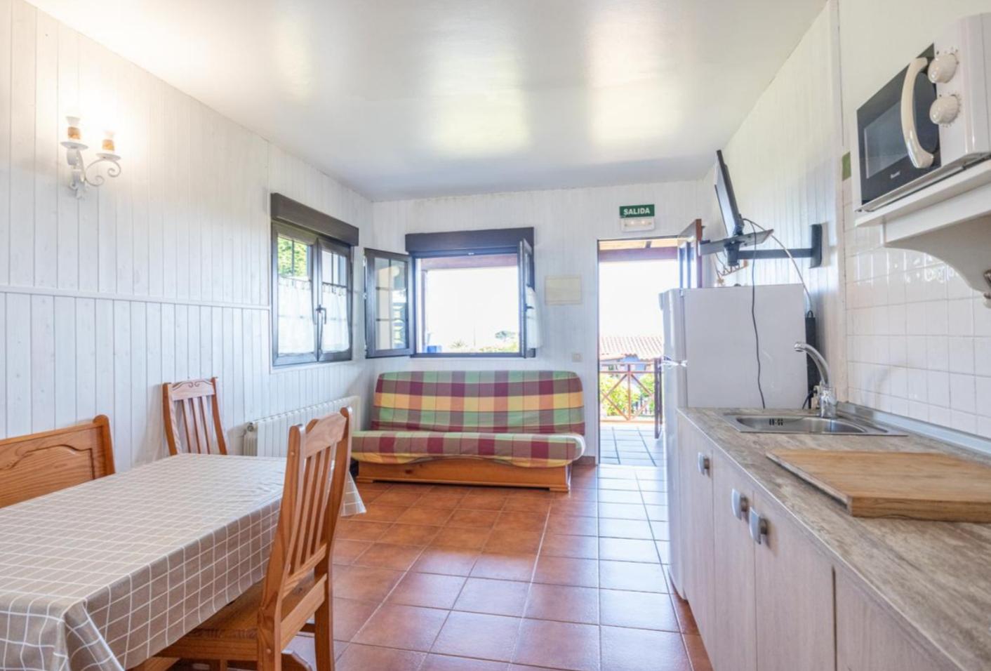 Dispone de una cocina totalmente equipada (nevera, vitrocerámica, microondas, menaje y televisión— además de un práctico sofá cama para mayor capacidad.